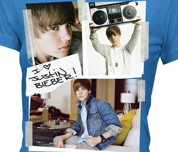Short sleeve, turquoise, youth T-shirt with a cut and paste design of Justin Bieber photographs and "I heart Justin Bieber" note. These shirts only fit young girls of about 10 to 12 years old and are not for teens. Made of 100% cotton. Available in small (5/6), medium (7/8), and large (10/12). All Justin Bieber merchandise is officially licensed.